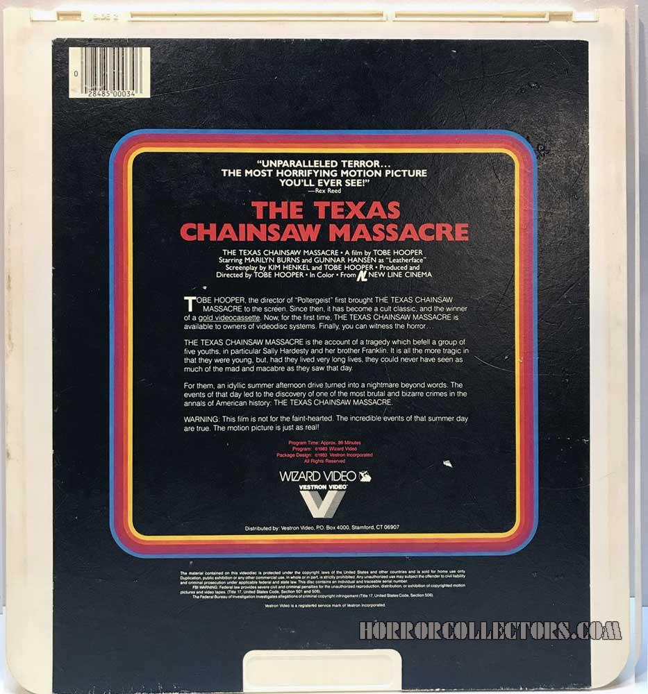 The Texas Chainsaw Massacre Wizard CED Video Disc by Spookydaz | Jul 18, 2021 | Uncategorized The Texas Chainsaw Massacre Wizard CED Video Disc Country: United States Category: Movie Tags: LEATHERFACE TEXAS CHAINSAW MASSACRE Tobe Hooper Wizard Video Click for more Wizard Video Vestron Click for more Texas Chainsaw Massacre (1974) Log in to add this item to your collection. The Texas Chainsaw Massacre Classic Horror Retro CED Video Disc Wizard Video Vestron Video Related Gallery CLICK HERE TO SEE WHAT IS The Texas Chainsaw Massacre Wizard CED Video Disc WORTH? WHAT IS The Texas Chainsaw Massacre Wizard CED Video Disc WORTH? Date Seen: July 17, 2021 Start Price: US $75.00 Sold For: US $75.00 eBay.com Condition: Item Details Bids: 1 Buy Texas Chainsaw Massacre (1974) on Amazon BUY NOW Click to search eBay for more The Texas Chainsaw Massacre Wizard CED Video Disc Click to search eBay for more Texas Chainsaw Massacre (1974) Movie Items for sale Click to search eBay for more Texas Chainsaw Massacre CED Items for sale More Horror Collectors Items you may like Maniac Japanese Nikkatsu Laserdisc Japan Movie George Romero Day of the Dead Second draft Script United States Other FRIDAY THE 13TH Part 3 in 3D JAPAN VHD VIDEO DISC Japan Movie Day of the Dead Turkish Lobby cards Turkey Lobby Cards